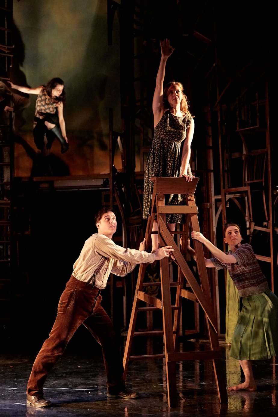 The visual portrayal of the castle is a chaotic heap of old spindly furniture which is witty and memorable. It towers over the performers like a crazy croque-en-bouche at a buffet.