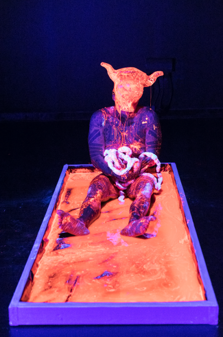 Apotheosis sees Athey naked as he merges into a pool of gleaming viscose goo and then rises clutching visceral guts or umbilical cord with pigs skull mask. Dark and beautiful this is visually stunning and moving. In the final part he is joined again on stage by Hermes Pittakos for a delicate and painstaking blood letting that depicts an old masters painting. On the screen behind a BDSM scene unfolds with fakir shoes and the insertion of an elaborate peacock feather buttplug. This closing scene has real tenderness and joy. Perhaps a celebration of life and fortitude it marries the work of Athey who tested positive for HIV over 30 years ago and has survived to see PrEP while also celebrating the work of fellow performance artist Jon John who recently died from cancer in his early thirties.