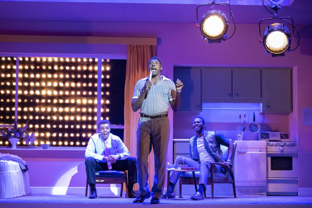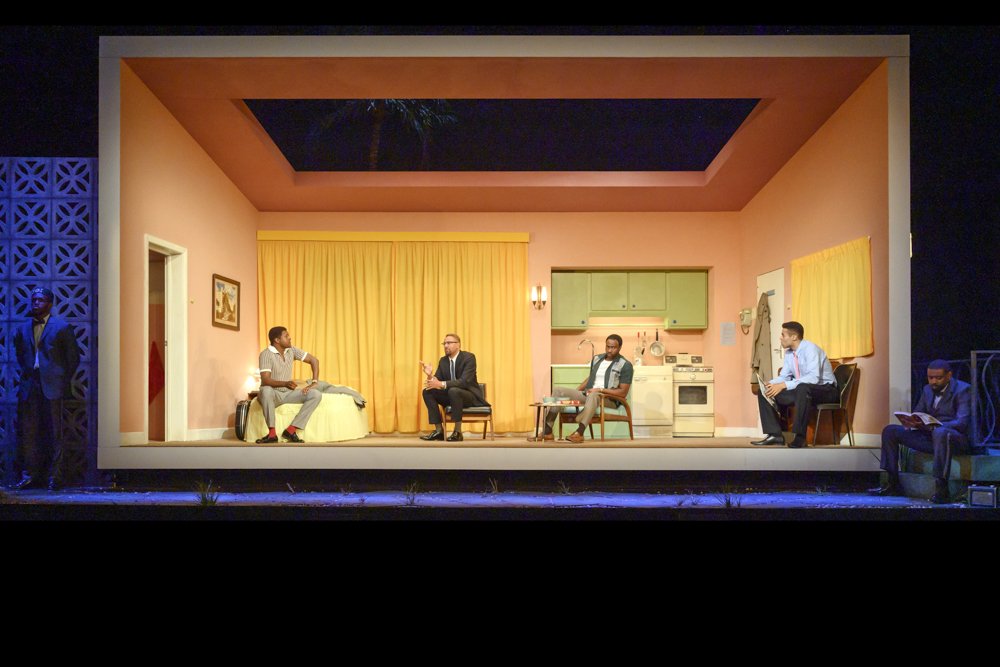 Designer Grace Smart has created a capsule motel room that effectively boxes in the four men as they talk privately but also works wonderfully well in recreating a boxing ring and an Auditorium stage. Lighting design by Ciarán Cunningham and sound by Max Pappenheim enhance the experience and help create the standout moments such as the boxing scene and when Sam Cooke sings. The neon sky and palm trees vividly contrast against the plain decor of the motel room, creating a perfect backdrop to the ordinary and extraordinary events unfolding in that room.