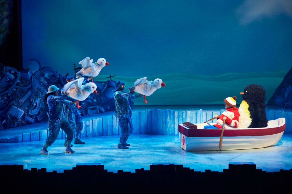 The use of puppetry by Puppetry Director Olly Taylor sees seagulls move around the theatre interacting with the children in the audience and also driving the narrative during set changes. The performers imbibe them with an uncanny realism that is delightful. The sense of perspective and distance of the journey undertaken by the boy and the penguin is further enhanced by the small models used in conjunction with the animation by Keyframe Studios. The combination of movement, music, animation and puppetry fills this large stage while also giving the sense of soaring space that is the South Pole.