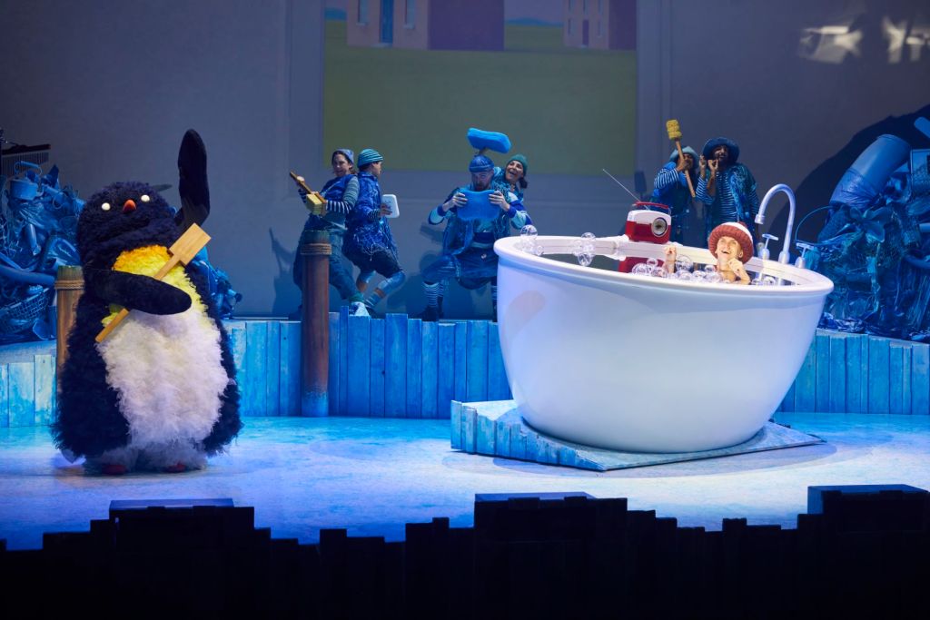 Softly colourwashed staging combines a set that displays the detritus of washed up flotsam and jetsam. It also serves to cleverly disguise some of the live musicians on stage and allows for the ebb and flow of props such as boats, bathtubs and the Lost and Found office. Set and Costume Designer Jean Chan has beautifully evoked every page of this illustrated storybook in the most delightful manner. Moments where a characters’ arms stretch out like retractable hoses to grab packages or a gleaming bathtub that conjures up a yellow duck seem effortlessly natural and therefore suspend reality and immerse the audience further in the pages of this storybook.