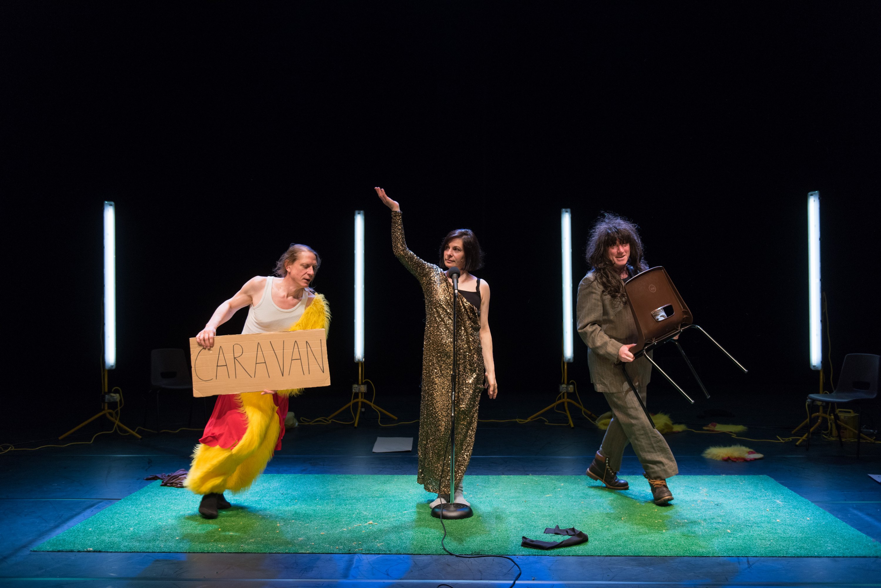 The second production was an madcap explosion of high energy that is so typical of shows like We Are Ian and Tricky Second Album from In Bed With My Brother. THE SHOWCASE has a reality gameshow element and alludes to Orwell’s 1984. This dance focused highly physical piece never lets up on pace and the students impress with their stamina alone! Their capacity to maintain momentum and keep a technical tightness in this anarchic production is commendable. The audience observes this repetitive dance and the performers enthusiastic desire to impress the disembodied voice directing them while also receiving behavioural response cues as if we are a TV audience reading an autocue. The resulting hi-velocity order starts to break down into chaos as performers falter or are cast aside or humiliated. There are elements here of a Forced Entertainment production as the music and the dance endlessly loop and repeat. The end result is funny, unsettling and provocative. This is how I imagine Squid Games might play out in a student theatre performance workshop…at least here they the only blood spilled was tomato pulp and sweat!!! Though I’d love to know if the crutch wielding performer was injured in rehearsals or elsewhere…either way a great embodiment of the show must go on!!