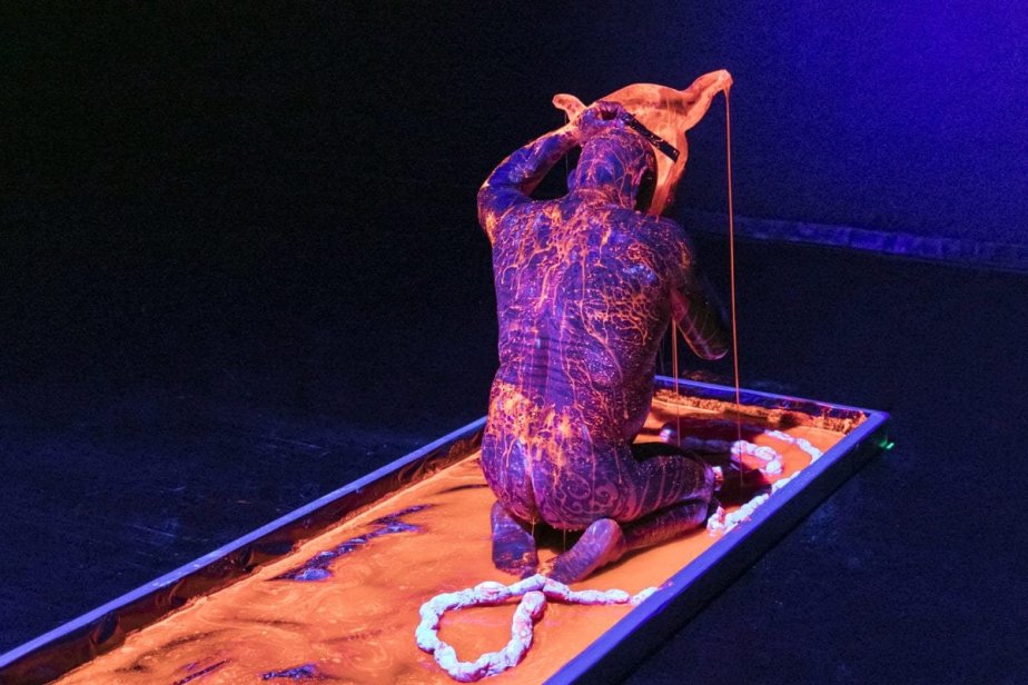 Apotheosis sees Athey naked as he merges into a pool of gleaming viscose goo and then rises clutching visceral guts or umbilical cord with pigs skull mask. Dark and beautiful this is visually stunning and moving. In the final part he is joined again on stage by Hermes Pittakos for a delicate and painstaking blood letting that depicts an old masters painting. On the screen behind a BDSM scene unfolds with fakir shoes and the insertion of an elaborate peacock feather buttplug. This closing scene has real tenderness and joy. Perhaps a celebration of life and fortitude it marries the work of Athey who tested positive for HIV over 30 years ago and has survived to see PrEP while also celebrating the work of fellow performance artist Jon John who recently died from cancer in his early thirties.