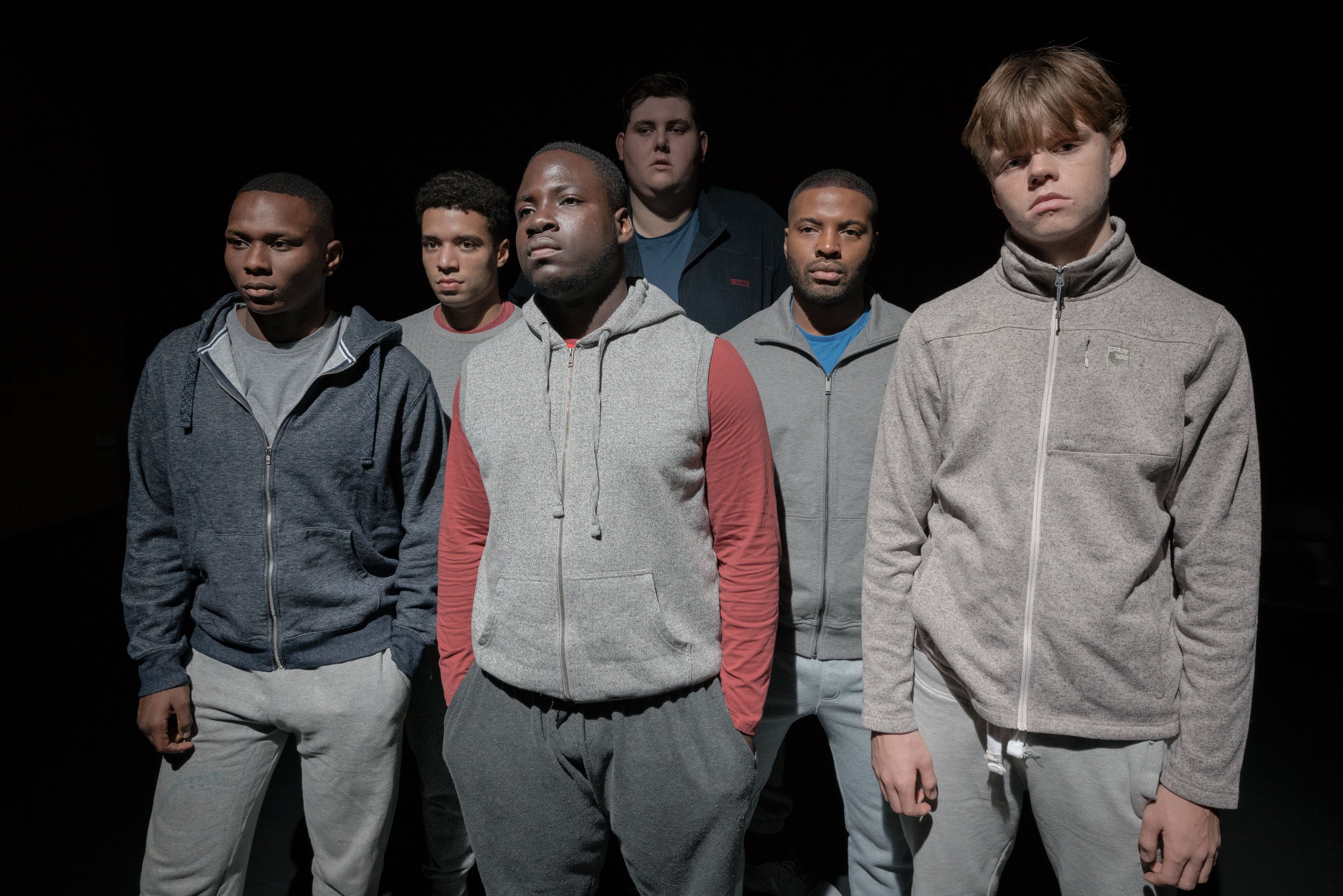 The traverse staging works really well creating both an intimacy as the actors can get close up to engage with the audience. Having the audience facing each other accross the stage also serves to remind us of the opposing factions that lead to so many refugeed fleeing their homes. Designer Katie Scott has created a set with the feel of a disused playground or skateboard park. This allows for loads of movement in this energetic piece and allows the young actors to be children as they leapfrog, slide or just hang out chatting. The overhead fluttering canopy of tent fragments is a stark nod to the tents at Calais and elsewhere.