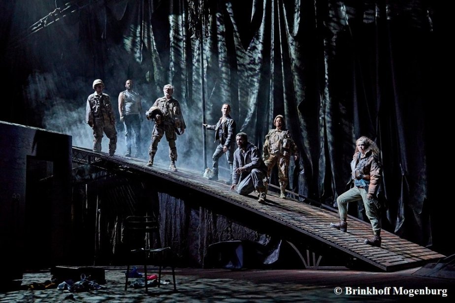 There is much to admire in this production. The Rae Smith set design is startlingly beautiful, glistening and mournful, it perfectly captures the mood of the piece. A metal bridge dominates the set, swinging back and forth across the stage like the warring factions fighting over a piece of turf land. This assists in adding dynamism to a production that at times can appear surprisingly static. The overall appearance is of a hopeless place with dank accommodation that creates a sense of a world in flux. Homes are breezeblock husks with scarce furnishings reminiscent of refugee camps which serves to drive home the ugliness of war and displacement.