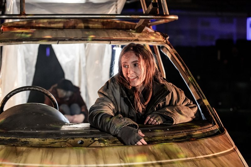 Anna Jordan shifts the action from the 17th century 30 year war to a dystopian future where its 2080 and both Europe and technology have vanished. This is a bleak, barren setting where the red and blue armies fight for space on a grid. With the demise of the E.U. there are no longer emotional connections to countries just a nameless land mass. Striding through this unforgiving setting is the eponymous Mother Courage with her 3 kids – 4 if you factor in her beloved van. Rough hewn cardboard sheets above the stage inform of each scene as do the disparate characters who introduce the action ensuring in true Brechtian fashion that the audience is not misled about what is about to unfold.